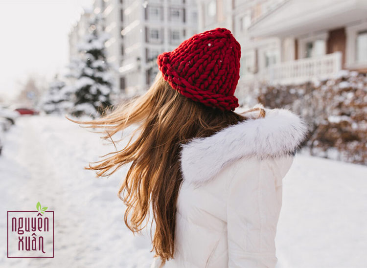 - Giữ ấm đầu khi ra ngoài: Hãy đội mũ hoặc trùm khăn nhẹ để tránh gió lạnh thổi trực tiếp vào tóc. Nên chọn mũ len hoặc khăn quàng làm từ chất liệu mềm, thoáng khí như cotton, len mềm hoặc lụa để hạn chế ma sát gây tĩnh điện và gãy tóc.