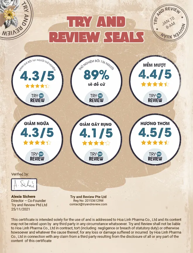 Dựa trên cơ sở khoa học, kết quả sau khi nghiên cứu kiểm định lâm sàng trên 120 tình nguyện viên từ 18 tuổi trở lên cho thấy dầu gội dược liệu Nguyên Xuân dưỡng tóc không gây kích ứng và dị ứng ở da (theo Giấy chứng nhận kết quả nghiên cứu số 594/BVDLTW-TNLS). Đồng thời, 88% đối tượng nghiên cứu đánh giá hài lòng về hiệu quả sản phẩm. Chứng nhận quan trọng này đưa thương hiệu Nguyên Xuân đến gần hơn với người tiêu dùng nhờ chất lượng của sản phẩm.